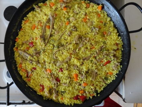 A zöldségeket, a húsokat tetszés szerint felvágjuk, miután megmostuk őket, majd bő olajban megdinszteljük a zöldségeket, illetve a húsokat átsütjük kicsit, amíg ki nem fehéredik. Fűszerezzük, majd hozzáadjuk a rizst, azt is üvegesre pirítjuk. A 2 csésze rizshez kell 5 csésze víz, amit szépen ráöntünk és megpróbáljuk lassabb tűzön puhára főzni. Nekem nagy a paella edényem, úgyhogy kinti tűzön főtt, ami nem lassú... Letakartam alufóliával is, mert nincs teteje. De amúgy kell a tető rá, résnyire legyen csak felemelve róla.